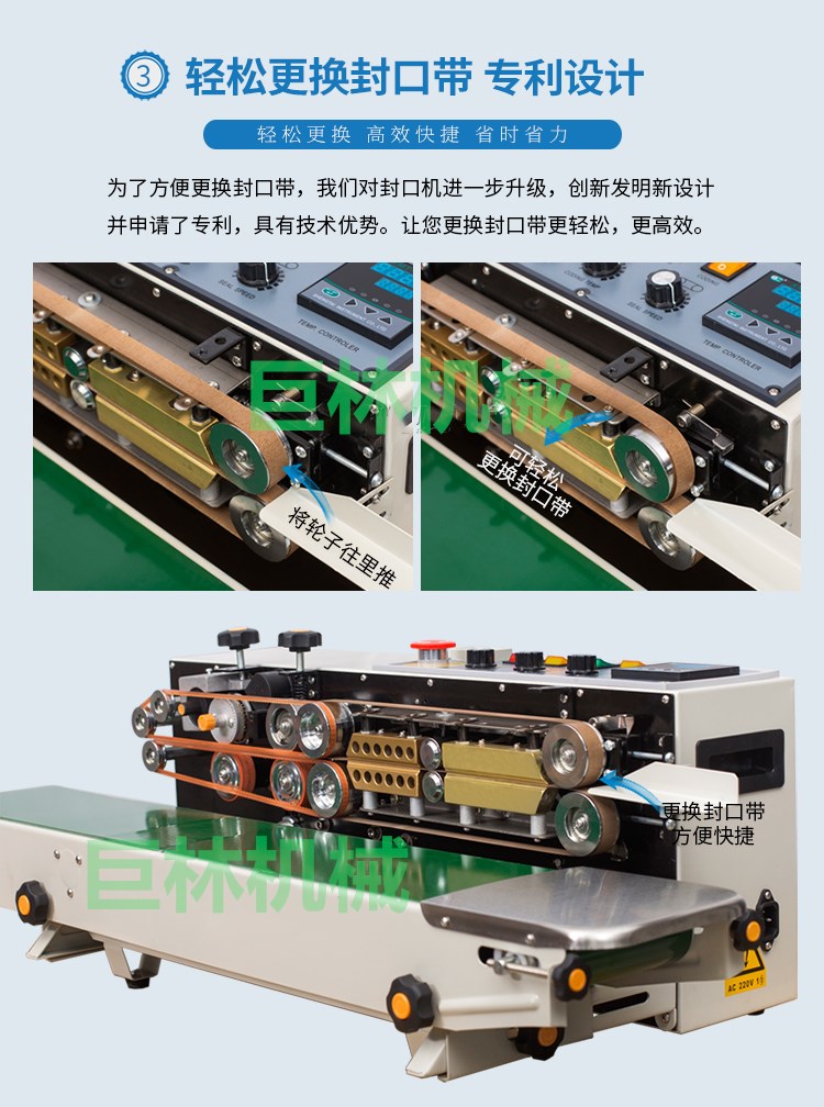本機(jī)是新一代集印碼,封口,連續(xù)輸送為一體的自動(dòng)薄膜封口機(jī),具有印字清晰、顔色可選、即印即干、換字方便等特點(diǎn)。